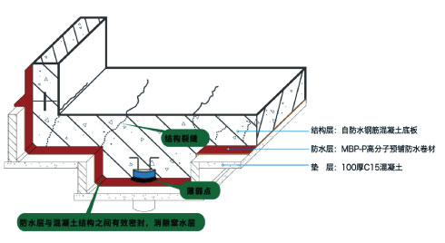 高分子自粘膠膜和混凝土中未初凝的水泥漿在壓力作用下,通過蠕變,相向滲過防粘層,形成有效的互穿粘結和巨大的分子間力。混凝土固化后,MBP-P高分子預鋪防水卷材和結構主體之間的空隙得到最大限度的永久密封,徹底消除了竄水通道。
